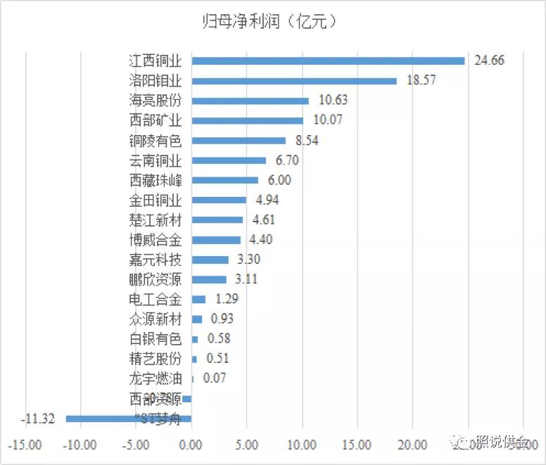 净利润方面,江西铜业归属母公司净利润为24.66亿元,位列铜行业19家上市公司净利润榜单第一。西部资源和*ST梦舟两家公司出现亏损,*ST梦舟亏损金额高达11.32亿元。