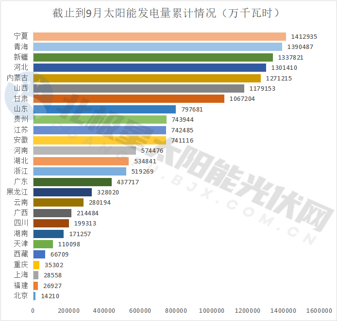 具体来看,宁夏、青海、新疆位居全国前三,分别达到1412935万千瓦时、1390487万千瓦时、1337821万千瓦时,其中宁夏光伏发电量排名居首,较上年同期增长16.2%。