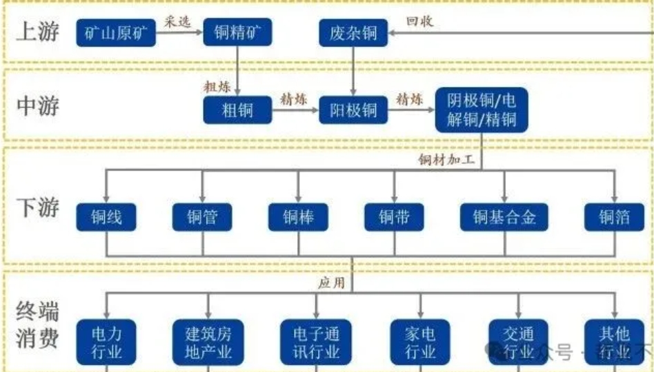 而铜产业链的下游,是铜的终端应用领域,覆盖电力、建筑、家电、交通运输、电子信息、新能源等多个行业。