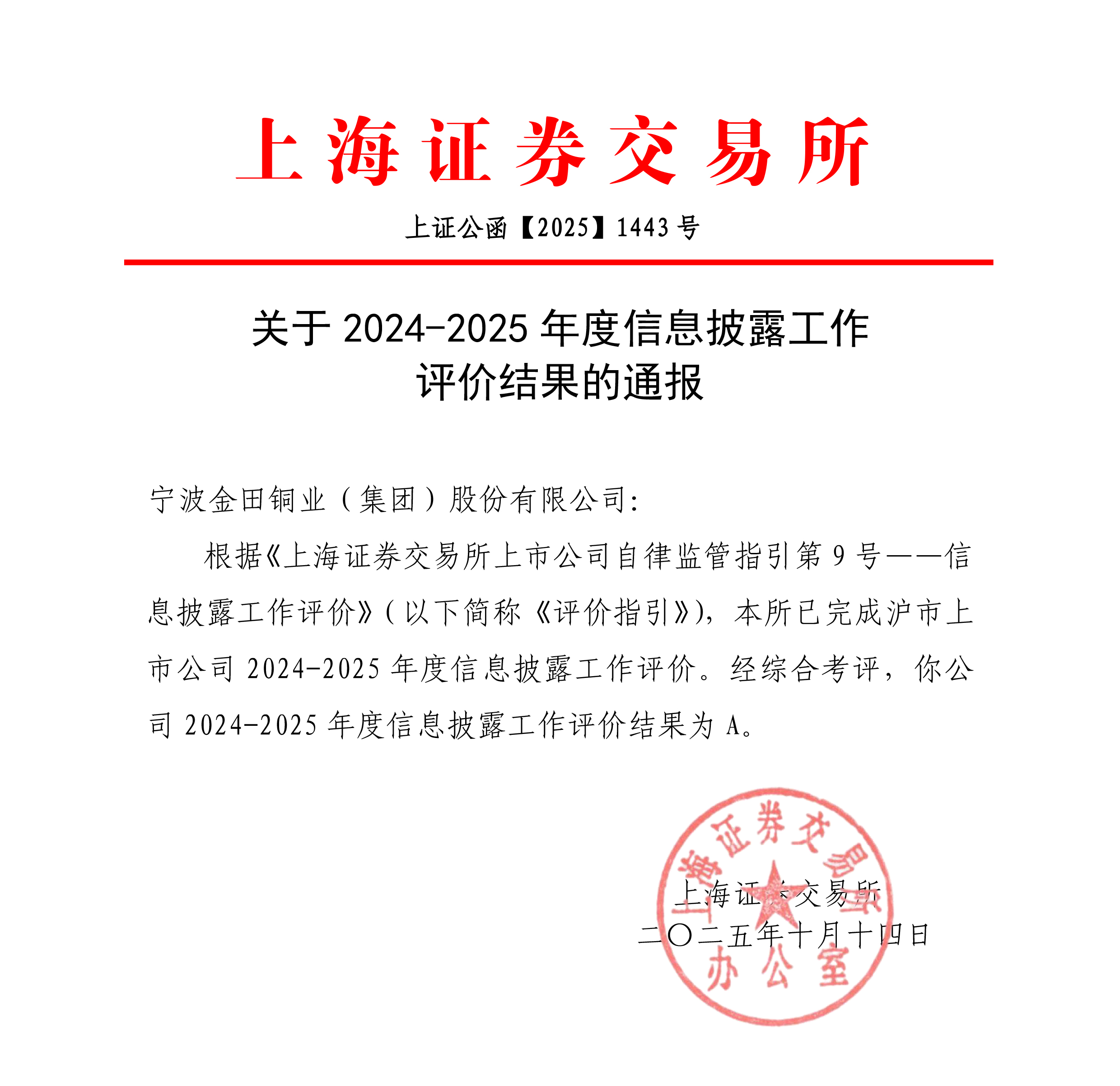 近期,金田铜业收到《沪市上市公司2024至2025年度信息披露工作评价结果》,荣获上海证券交易所信息披露工作最高评价(A级),体现了监管机构对公司在信息披露、合规治理及投资者关系等方面工作的认可。本届荣获该奖项的宁波主板上市公司仅6家。