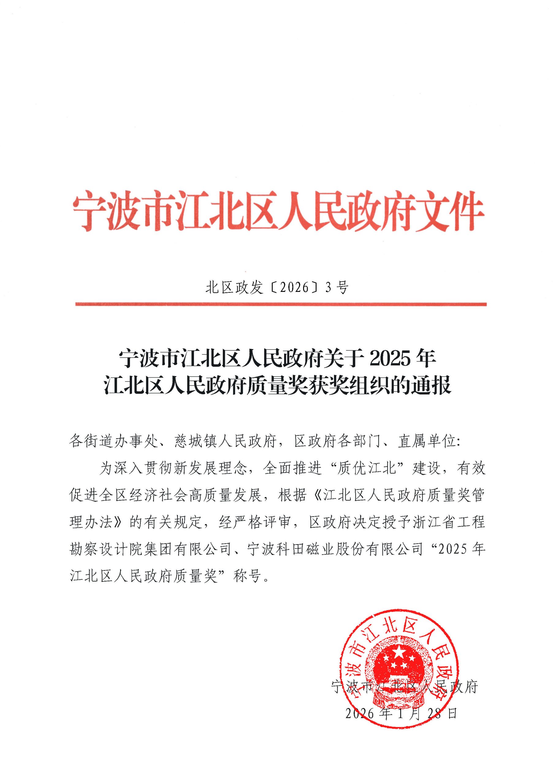 近日,宁波科田磁业股份有限公司凭借过硬的产品品质、创新赋能的管理体系及亮眼的综合绩效,成功斩获“宁波江北区人民政府质量奖”这一重磅荣誉。