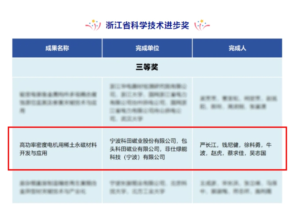 2月9日,浙江省建设一流创新生态打造最具竞争力营商环境大会在杭州举行,大会公布并表彰了2024年度浙江省科学技术奖获奖项目。宁波科田磁业股份有限公司的“高功率密度电机用稀土永磁材料开发与应用”项目获得省科学技术进步三等奖。科田磁业研制的新型磁体应用于新能源驱动电机系统,功率密度提升最高达28.1%,技术水平达到国际领先。下一步,科田磁业将继续加大研发投入力度,加快高性能磁体研发,确保“十五五”战略目标达成。